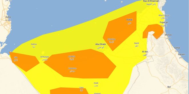 ويغطي اللون الأصفر باقي مناطق الدولة تقريبا وفقا للخريطة التي نشرها المركز الوطني للأرصاد على صفحته الرسمية بمنصة أكس (تويتر سابقا) وتعني: “خذ الحذر (يرجى الانتباه) يرجى أن تبقى على اطلاع حول تطور حالة الطقس”.