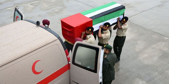 وأضافت الوكالة في تقريرها: “وصلت إلى مطار البطين الخاص بأبوظبي، صباح اليوم (الأحد)، جثامين شهداء الوطن الأبرار الأربعة، (العقيد محمد المنصوري، والوكيل/ 1 محمد الشامسي، والوكيل/ 1 خليفة البلوشي، والعريف سليمان الشحي)، وذلك على متن طائرة عسكرية تابعة للقوات المسلحة”.