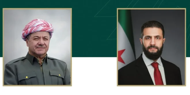 أجرى الرئيس السوري أحمد الشرع اتصالاً هاتفياً مع مسعود بارزاني، رئيس الحزب الديمقراطي الكوردستاني، بحث خلاله التطورات الأخيرة في سوريا.