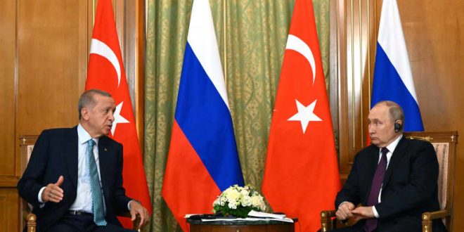ووصف الرئيس الروسي اللقاء مع أردوغان بأنه “عُقد في أجواء بناءة وشبه تجارية”.