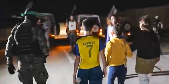 صورة من فيديو نشره المكتب الإعلامي لحماس تظهر مقاتلين من حماس يرافقون رهائن إسرائيليين تم إطلاق سراحهم، الاثنين، إلى مركبة تابعة للصليب الأحمر في قطاع غزة في 27 نوفمبر/ تشرين الثاني 2023.