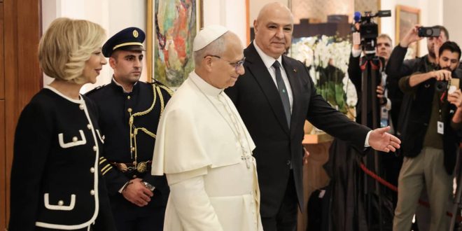 وقال الرئيس اللبناني جوزاف عون في كلمته خلال استقبال البابا لاوُن الرابع عشر في قصر بعبدا :”بفرح عظيم، أرحب بكم، رسول سلام في وطن السلام. بشرف عظيم، وباسم الشعب اللبناني بكل مكوّناته وطوائفه وانتماءاته، أرحّب بكم في هذا الوطن الصغير بمساحته، الكبير برسالته، لبنان الذي كان وما زال أرضاً تجمع بين الإيمان والحرية، بين الاختلاف والوحدة، وبين الألم والرجاء”، بحسب ما نقلت عنه الوكالة الوطنية اللبنانية للإعلام.