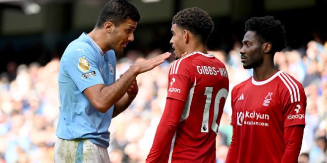 نشب شجار بين رودري، لاعب نادي مانشستر سيتي، ولاعب نادي نوتينغهام فورست، مورغان جيبس وايت، خلال مواجهة الفريقين على أرض استاد الاتحاد، ضمن منافسات الدوري الإنجليزي الممتاز (البريميرليغ).