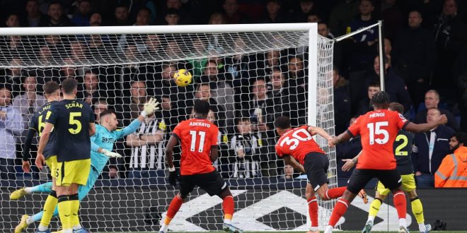 سدّد أندروس تاونسند، لاعب لوتون تاون، الكرة إلى خارج ملعب الفريق، خلال مواجهته لنظيره نيوكاسل يونايتد ، ضمن منافسات الدوري الإنجليزي الممتاز (البريميرليغ).