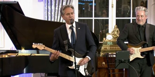 تداول نشطاء على مواقع التواصل الاجتماعي مقطع فيديو لوزير الخارجية الأمريكي، انتوني بلينكن، يغني ويعزف القيثارة الأمر الذي أثار تفاعلا.