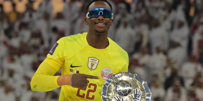 تدوال نشطاء على مواقع التواصل الاجتماعي صورا ومقاطع فيديو للحظة تتويج حارس مرمى المنتخب القطري، مشعل برشم، لنظارة خلال عقب الفوز على المنتخب الأردني بنهائي بطولة كأس آسيا 2023.
