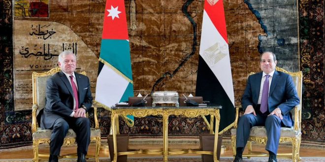 أكد العاهل الأردني والرئيس المصري عبدالفتاح السيسي، “رفضهما التام لجميع محاولات تصفية القضية الفلسطينية، أو لتهجير الفلسطينيين خارج أراضيهم أو نزوحهم داخليًا”، حسب بيان رئاسي مصري حول زيارة الملك عبدالله الثاني إلى القاهرة.