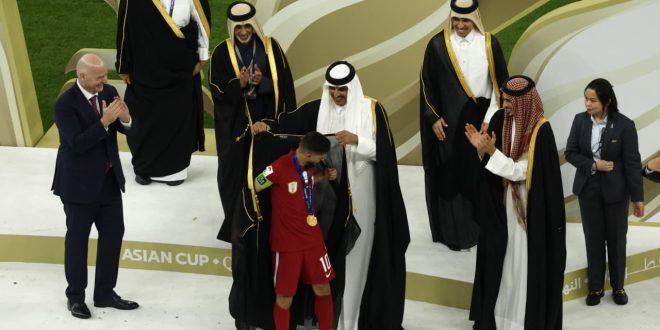 لاعب قطر يثير تفاعلاً بعدما ألبسه تميم بن حمد “البشت” بمراسم التتويج بلقب كأس آسيا