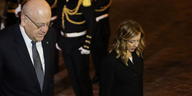 وأجرى ميقاتي محادثات مع ميلوني في السرايا مساء الأربعاء، تم التطرق خلالها إلى ” العلاقات الثنائية الوثيقة والتاريخية بين لبنان وإيطاليا، إضافة إلى الموضوعات ذات الاهتمام المشترك على صعيد منطقة الشرق الأوسط”، وفقا للموقع الرسمي لرئاسة مجلس الوزراء اللبنانية.
