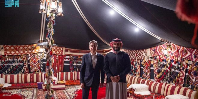 التقى ولي العهد السعودي رئيس مجلس الوزراء، الأمير محمد بن سلمان، في المخيم الشتوي في محافظة العُلا، الاثنين، مع وزير الخارجية الأمريكي أنتوني بلينكن.